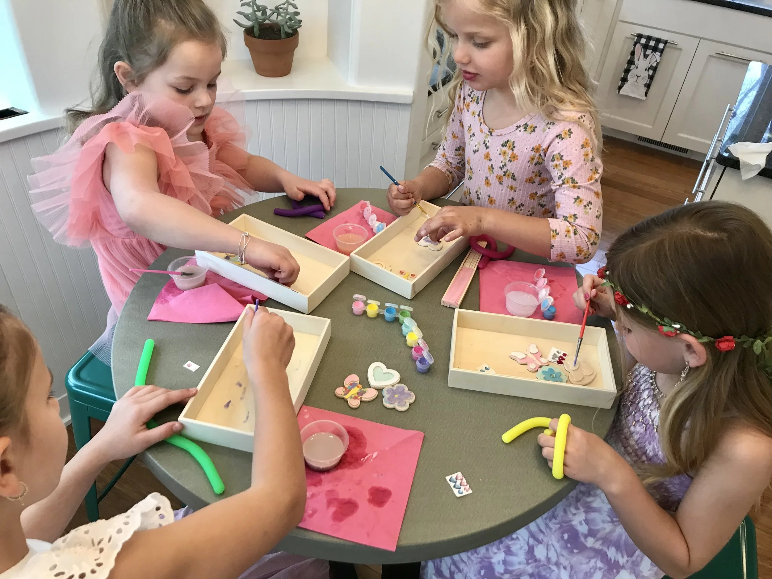 We also celebrated Natalie with a mother-daughter tea party in our dining room. There was pink punch, trays of cookies, cheese and crackers and, of course, cake! We used my great-grandmothers antique tea trays which was the exact right use of those heirlooms. The girls painted wooden magnets, played with their dolls (who were also invited to the party) and helped Natalie break in her new birthday presents. It was complete and total girlie cuteness and just perfect for our Miss Natalie birthday.